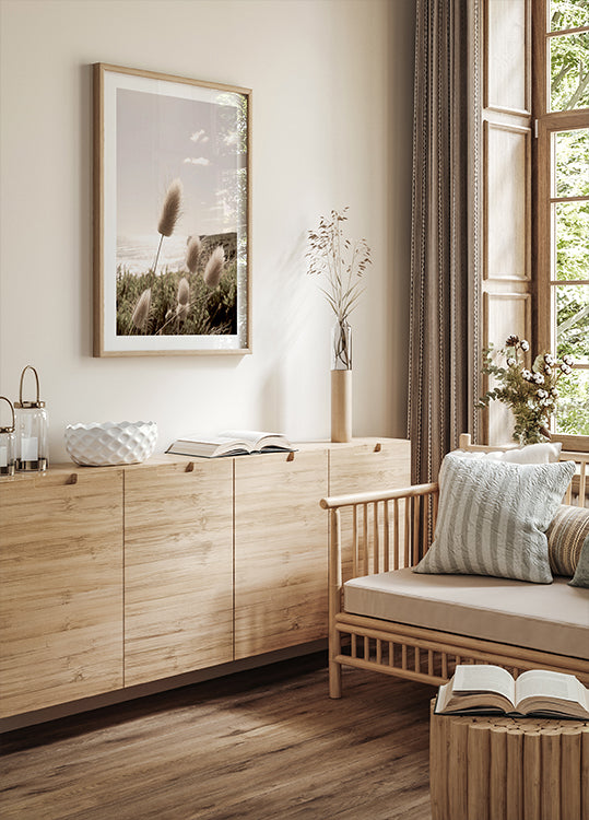 Un póster que representa césped suave en un paisaje montañoso, perfecto para agregar calma y belleza natural a cualquier habitación.