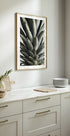 Un intenso primer plano de una piña captura las formas esculturales de la corona de la hoja y el patrón gráfico de la cáscara en tonos verde intenso y dorado. Los recortes ajustados y la suave iluminación del estudio crean una expresión tranquila y moderna con energía tropical fresca y una textura sensual que eleva el espacio. Perfecto como foco de calma en la cocina o el salón.