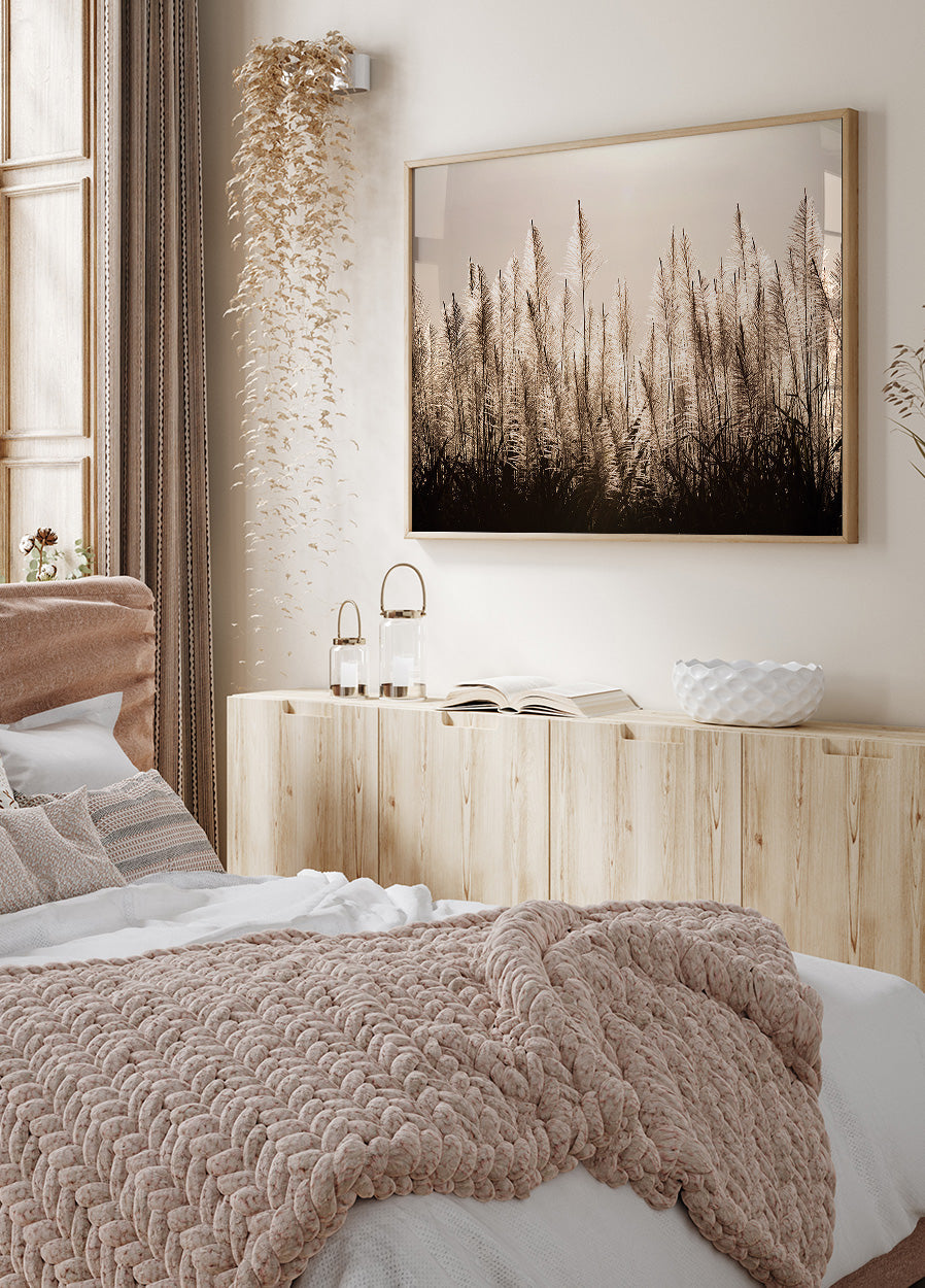 Póster de penachos de caña de azúcar al atardecer