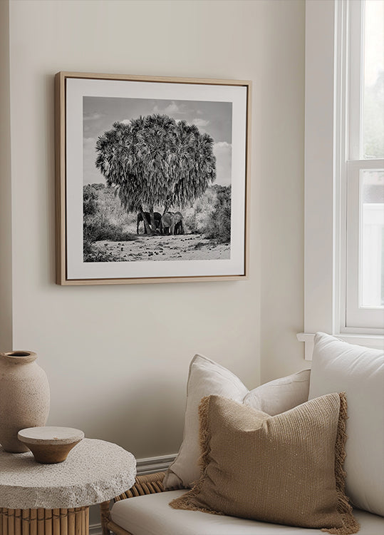 reunión del mediodía por el fotógrafo Marcel Rebro captura una manada de elefantes reuniéndose a la sombra de un árbol solitario en la sabana de África Oriental. En un espectacular blanco y negro, las sombras nítidas del sol del mediodía dibujan los contornos y crean una escena tranquila y atemporal del paisaje salvaje de Tsavo. Perfecto para los amantes de la naturaleza, los safaris y la fotografía clásica.