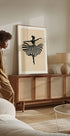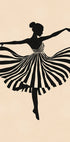 Una elegante silueta negra de una bailarina en medio de una pirueta, con el vestido a rayas ondeando con elegante movimiento. El fondo beige suave y el fuerte contraste le dan a esta pieza una sensación elegante y atemporal, perfecta para agregar movimiento artístico a la pared de la sala de estar, el estudio o la galería.