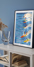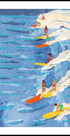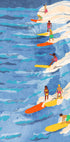 Una ilustración animada y colorida de surfistas montando olas en longboards, capturando la energía despreocupada del verano y la vida marina. Con colores fuertes y movimiento dinámico, esta pieza celebra los deportes acuáticos, los viajes y el ocio y encaja perfectamente en interiores de inspiración costera o de surf retro.