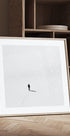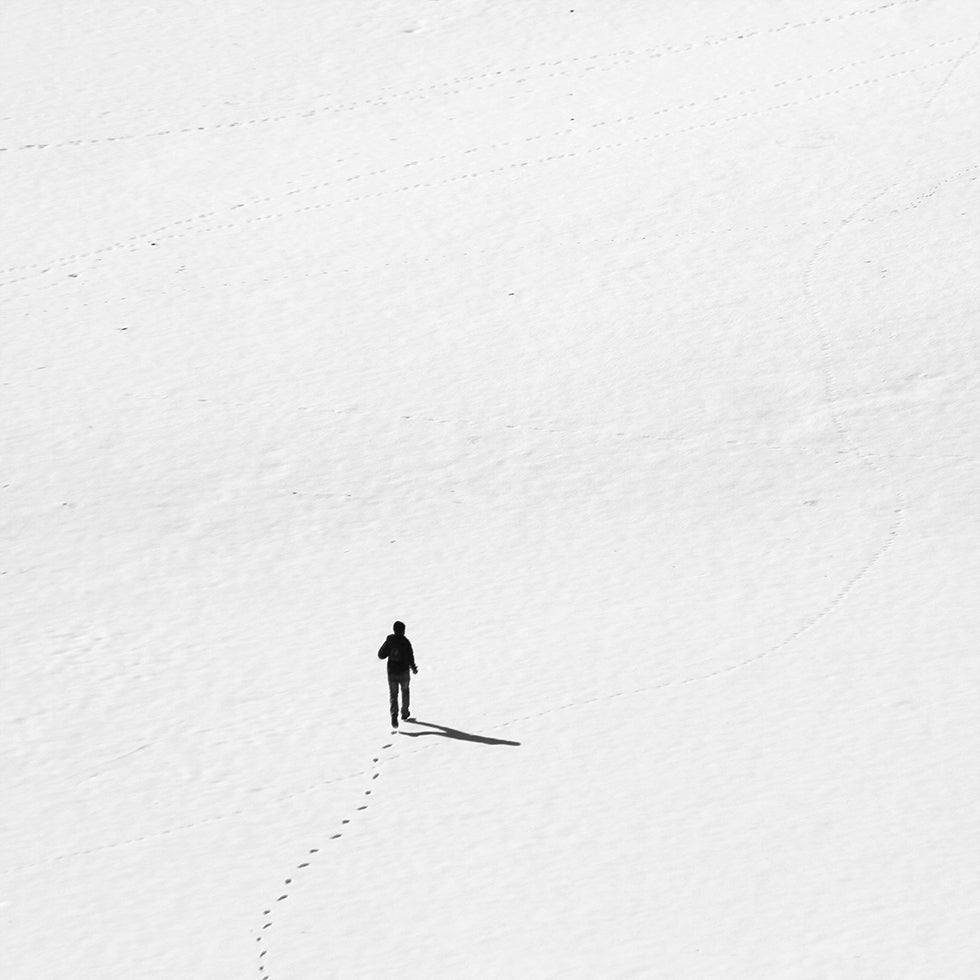 Una poética fotografía aérea en blanco y negro de un paisaje nevado, donde una sola persona y sus huellas cortan el blanco silencio. Las largas sombras y el alto contraste crean una calma minimalista y una sensación de inmersión. Una composición invernal atemporal de MOSTAFA NODEH. El motivo equilibra el silencio y la emoción en un espacio gráfico y nevado.