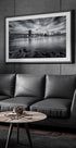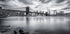 Un espectacular paisaje urbano en blanco y negro del Puente de Brooklyn que cruza el río Hudson, con el icónico horizonte de Manhattan al fondo. Las evocadoras nubes y la larga exposición del agua crean una atmósfera cinematográfica atemporal que captura la esencia de Nueva York.