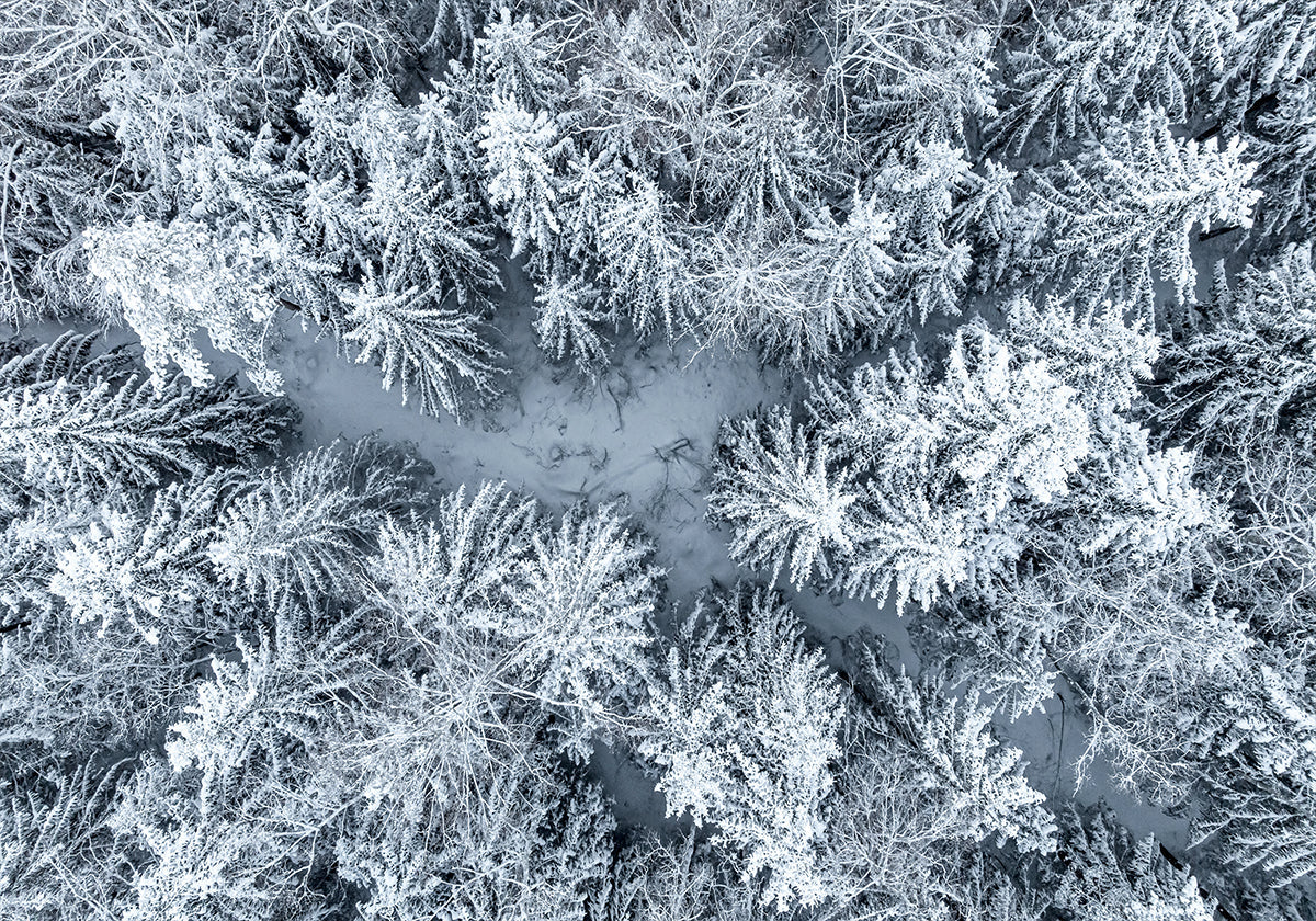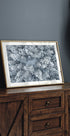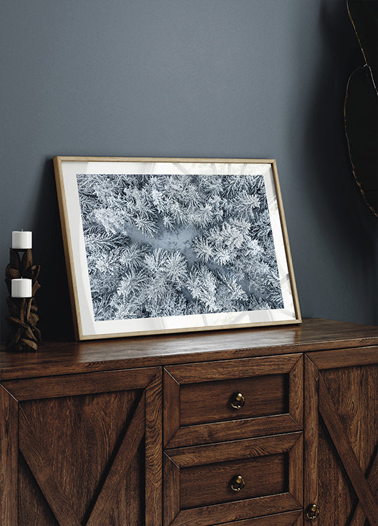 Una tranquila atmósfera invernal se desarrolla en un bosque tenue, donde la nieve extiende un suave manto sobre las oscuras siluetas de los árboles. La neblina y los tenues tonos de azul crean calma y profundidad, mientras que los rastros de luz guían la vista hacia el paisaje. Una atmósfera poética y nórdica, creada por Margus Vilisoo. Perfecto para paredes invernales y tranquilidad en la habitación.