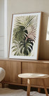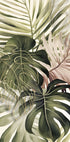 Una elegante composición botánica con exuberantes hojas tropicales en suaves tonos verdes con toques de rosa y detalles dorados. El diseño combina hojas de palmeras exóticas y monstera para una apariencia moderna de inspiración bohemia, perfecta para agregar frescura y elegancia a cualquier decoración.
