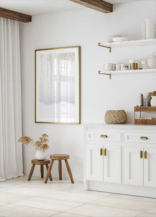 Winter Reflection de Laurentiu Pavel captura la quietud del invierno nórdico: los árboles desnudos se alzan como siluetas gráficas a lo largo de las orillas, reflejados perfectamente en el agua helada. La atmósfera luminosa y brillante y la paleta limitada de tonos blancos y grises crean calma, armonía y una profundidad meditativa en la habitación. Un poético paisaje invernal que invita a la contemplación.