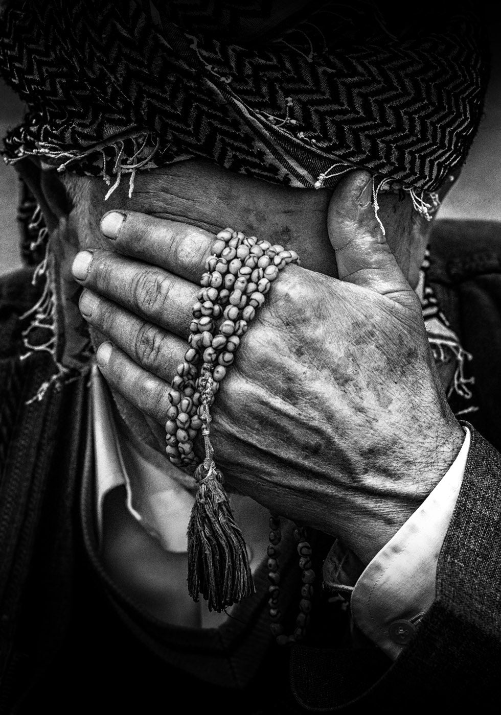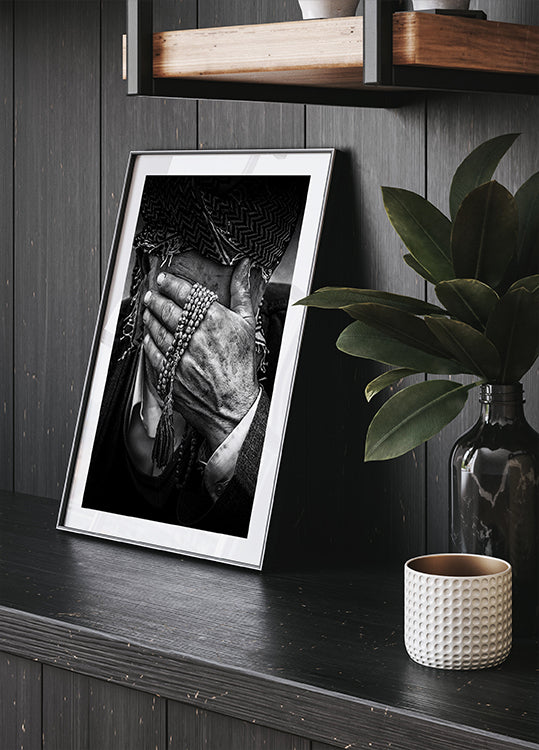 Un fuerte retrato en blanco y negro que captura las profundas emociones de un anciano kurdo. Sus manos curtidas por la intemperie, decoradas con rosarios, cubren partes de su rostro, expresando consideración, fuerza y herencia cultural. Una fotografía conmovedora que aporta emoción y tradición crudas a cualquier decoración.