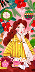 Una escena navideña cálida y retro: una mujer pelirroja sonriente con una blusa a rayas disfruta de un té humeante junto a un árbol de Navidad reluciente lleno de adornos y guirnaldas. La nieve brilla en la ventana, los colores rosa y verde pino crean nostalgia. Una acogedora ilustración inspirada en mediados de siglo de Caroline Bonne Müller. Perfecto para divertirse en invierno.