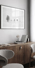 Et grafisk, højkey vintermotiv af Peter Svoboda MQEP: En enlig skiløber skærer spor i en næsten hvid, sneklædt bjergside, mens få mørke træer og konturer tegner en minimalistisk kontrast. Den monokrome komposition emmer af ro, kulde og fokus – et poetisk øjeblik i bevægelse. Motivet balancerer tomrum og struktur i et strengt, grafisk udtryk.