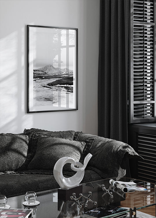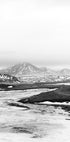 Un paisaje gráfico en blanco y negro de Lynann Colligan: un río islandés helado serpentea a través de la tundra hacia montañas distantes bajo un cielo vasto y tranquilo. Los contrastes entre las grietas del hielo y las suaves superficies de la nieve crean profundidad y calma, con minimalismo nórdico y cruda poesía invernal. Una mirada monocromática y atemporal al poder de la naturaleza.