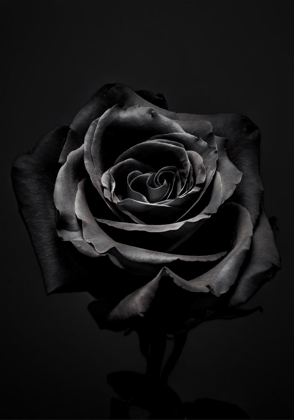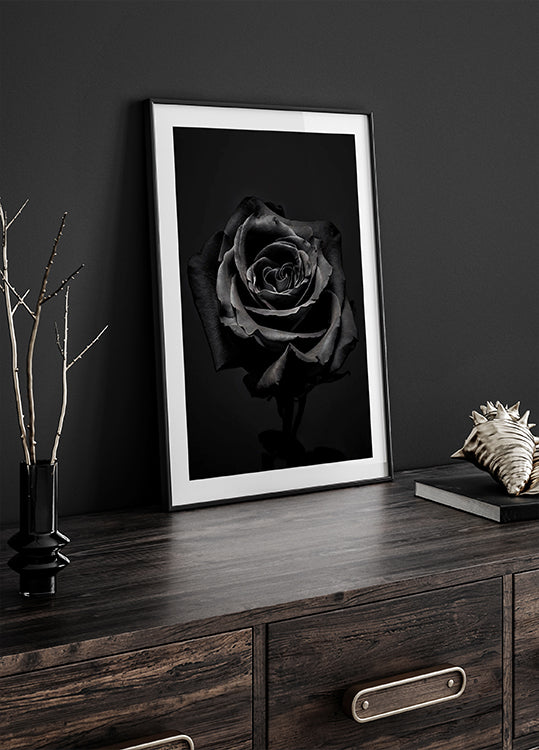 Un sorprendente primer plano de una rosa negra sobre un fondo oscuro, que simboliza misterio, elegancia y fuerza. Este espectacular arte floral es perfecto para interiores modernos, góticos y minimalistas.