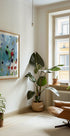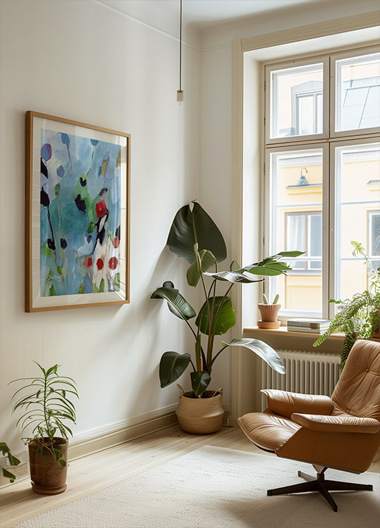 Janel Braggs Rose Hips At Christmas fanger vinterens poesi: glødende røde hyben på fine grene, sat mod kølige blå og grønne akvarelstrøg. Den abstrakte komposition balancerer lethed og dybde, og skaber en stemningsfuld, julet botanisk scene, der tilfører varme og farve til ethvert rum. Perfekt som vinterlig fokus i stuen eller som poetisk gave.