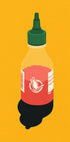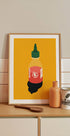 Una ilustración atrevida y moderna de una botella de salsa de chile sobre un fondo amarillo vibrante. Minimalista pero llamativa: esta obra de arte gráfica aporta una divertida energía pop-art a cocinas, comedores o interiores modernos, siendo una declaración divertida para los entusiastas de la comida y el diseño.