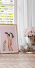 Un póster atrevido y elegante que irradia un ambiente de fiesta con piernas elegantes con tacones negros y una copa de champán brillante sobre un fondo rosa pastel. La combinación de moda, celebración y glamour disco hace de este un póster perfecto para interiores modernos.