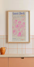 Un póster divertido y moderno que muestra una tarjeta de huésped de un restaurante de estilo vintage superpuesta con bocetos en rosa de cócteles y copas para brindar. La combinación de tipografía y arte gráfico crea un diseño atrevido y moderno, perfecto para cocinas, bares o para cualquiera que ame los estampados extravagantes y llamativos.