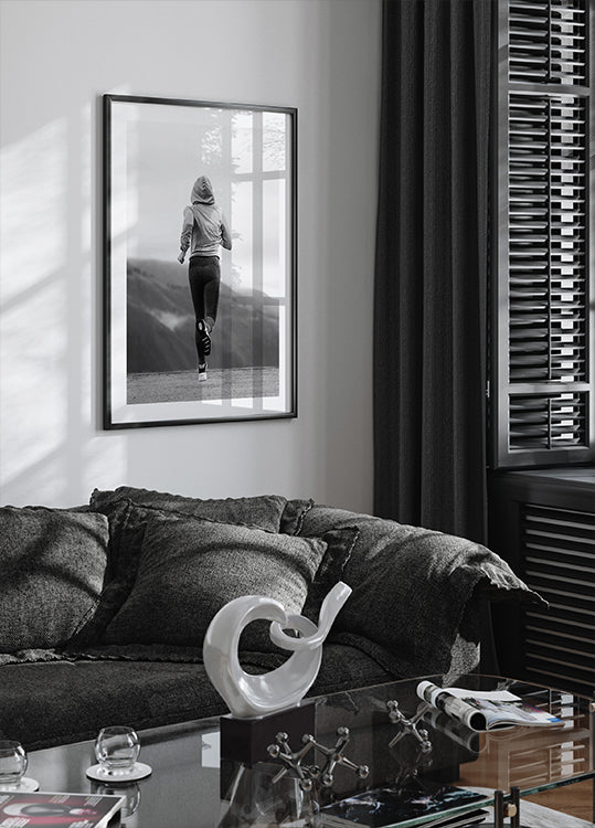 Una impactante fotografía en blanco y negro que captura la esencia de la perseverancia y la determinación. Esta obra de arte, que presenta un corredor en movimiento contra un fondo montañoso, simboliza fuerza, resistencia y determinación. Un póster motivador perfecto para los entusiastas del fitness y quienes llevan un estilo de vida activo.
