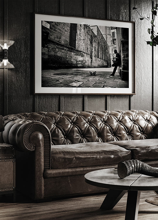 Una evocadora escena urbana en blanco y negro: un saxofonista solitario vierte jazz en una calle estrecha de Barcelona, con balcones y paredes de ladrillo enmarcando la casa. GertJan van Geerenstein captura el pulso tranquilo de la soledad urbana, donde las sombras, la perspectiva y las notas persistentes convierten el callejón en un escenario. Un silencio cinematográfico flota en el aire.