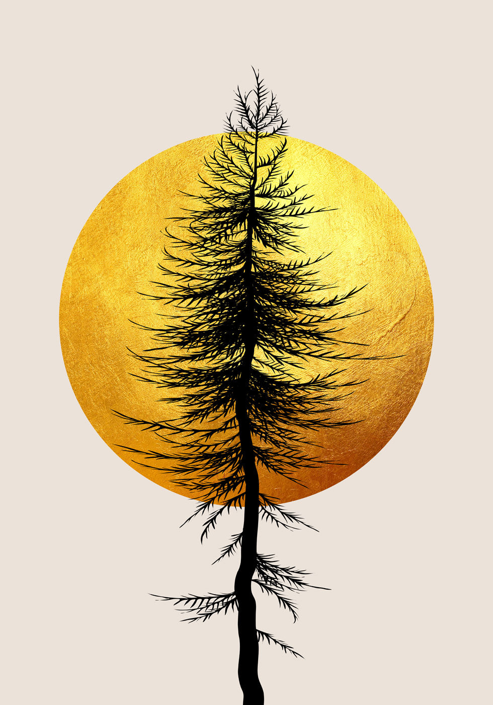 Una llamativa composición minimalista con la silueta de un árbol negro recortada contra un brillante sol dorado. El fondo dorado texturizado crea un hermoso contraste con las delicadas ramas, brindando una estética moderna e inspirada en la naturaleza. Perfecto para los amantes de la elegante sencillez, la decoración escandinava y el diseño moderno.
