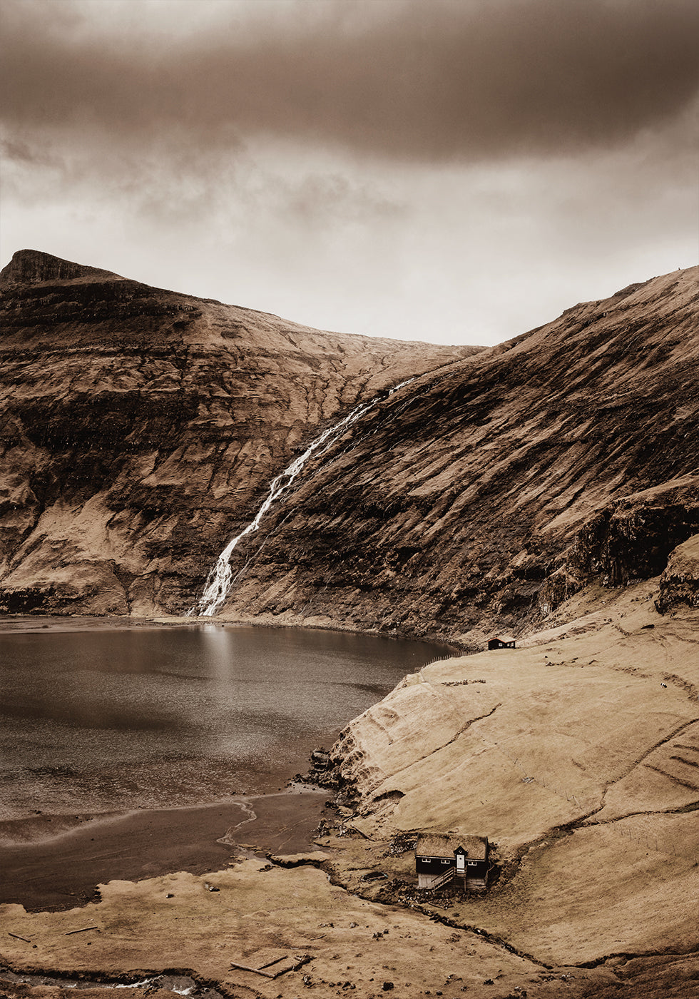 Una imagen apacible y rústica de una casa solitaria junto a un lago tranquilo con una cascada impetuosa al fondo. Los tonos apagados y el cielo dramático crean una atmósfera serena y melancólica.