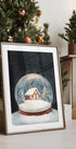 Træd ind i vintermagien: En klassisk snekugle med lille by, fyrretræer og et hyggeligt hus badet i varmt lys, fanget i dybe grønne og mørke nuancer. Snefnug danser i stille nat og vækker retro julestemning og nostalgi. Under glasset hvirvler sneen om graner og tage. Et stemningsfuldt motiv af Melloi Art Prints.