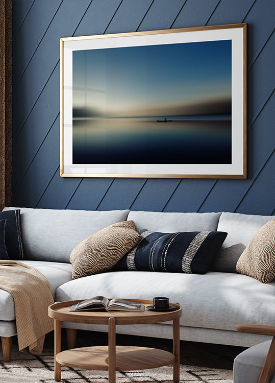 Un tranquilo paisaje acuático donde un remero solitario se desliza sobre aguas tranquilas bajo un cielo suave en tonos de color. Con un desenfoque pictórico y una composición minimalista, la obra evoca sentimientos de soledad, paz y calma espiritual, capturando la tranquila belleza del aislamiento y el ritmo meditativo de ser uno con la naturaleza.