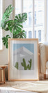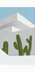 Una estética moderna del desierto cobra vida en esta ilustración minimalista con altos cactus verdes enmarcados por líneas arquitectónicas limpias y un cielo azul tranquilo. La interacción entre la luz, la sombra y la geometría captura un momento en un patio iluminado por el sol: un cartel llamativo para interiores modernos e inspirados en la naturaleza.
