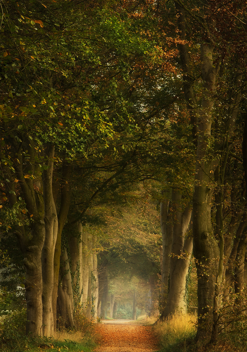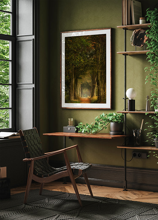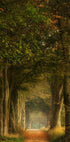 Un sendero forestal de ensueño cubierto de hojas de otoño, rodeado de altos árboles y una suave luz dorada. Esta obra de arte captura la tranquila belleza de la naturaleza y evoca sentimientos de paz, reflexión y viajes eternos a través de bosques encantadores.