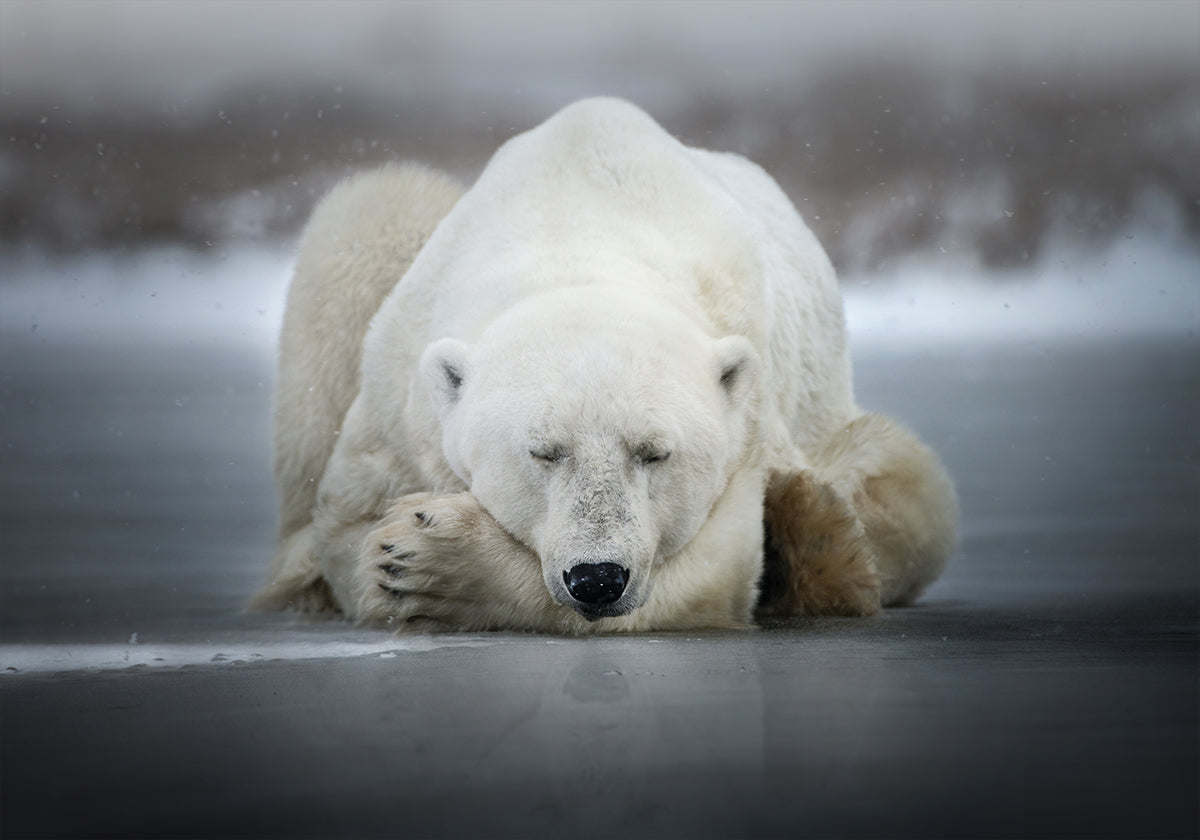 Una fotografía de naturaleza pacífica que muestra a un oso polar descansando tranquilamente sobre el hielo con los ojos cerrados en profundo reposo. La composición evoca temas como la atención plena, la espiritualidad y la conexión sagrada entre la naturaleza y el silencio. Un fuerte recordatorio de la fuerza y la vulnerabilidad de la naturaleza.