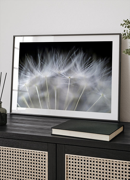 Una delicada fotografía macro de semillas de diente de león, que captura su suavidad y belleza como plumas. El primer plano resalta la naturaleza frágil y fugaz de estos aireados mechones.