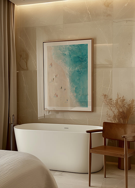Una serena y elegante fotografía aérea de personas caminando por la orilla, donde el mar turquesa se funde con la arena clara. Ideal para casas de verano, espacios de inspiración costera y arte mural moderno.