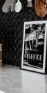 Un llamativo póster en blanco y negro con la palabra "CAFÉ" combinado con un primer plano de una máquina de café expreso sirviendo café recién hecho en una taza. Perfecto para paredes de cocinas, cafeterías o cafeterías, este diseño tipográfico minimalista combina inspiración con una elegante estética monocromática.