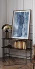 Un motivo tranquilo y abstracto en tonos azules profundos, donde líneas verticales y fluidas forman un flujo helado a través de la imagen. La paleta monocromática brinda un ambiente fresco y moderno, mientras que los movimientos suaves crean equilibrio y profundidad. Perfecto para estancias minimalistas que buscan calma y estilo, o como contraste en interiores cálidos.
