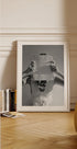 Una impactante fotografía de moda en blanco y negro que muestra a una mujer sosteniendo una revista Vogue Italia frente a su cara, luciendo un collar de gran tamaño y un conjunto texturizado. La obra de arte captura la mística y el encanto del mundo de la moda, una mezcla de anonimato y estilo audaz. Perfecto para interiores modernos y paredes de galerías inspiradas en la moda.