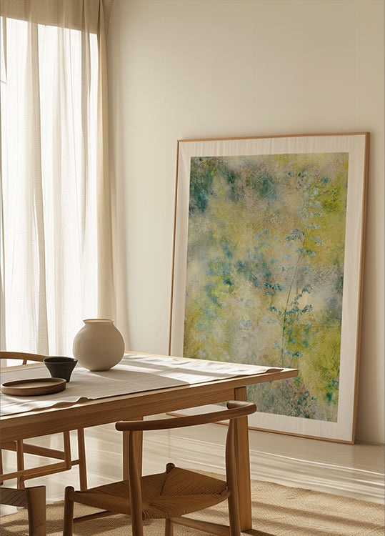 Una delicada obra de arte impresionista que combina formas botánicas con suaves texturas pictóricas. Los delicados tonos de verde, azul y amarillo dorado crean una atmósfera tranquila y de ensueño que captura la belleza fugaz de la naturaleza. Perfecto para añadir un ambiente relajante y artístico a cualquier habitación.