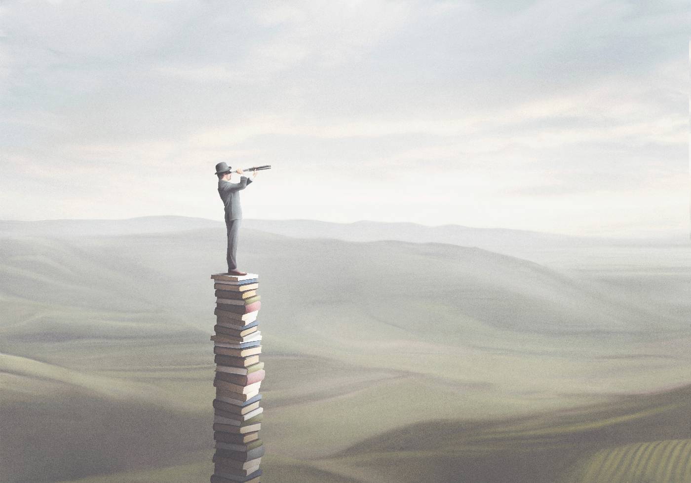 El póster de la Torre de los Libros* es una inspiradora ilustración surrealista que simboliza el conocimiento, el aprendizaje y las nuevas perspectivas. Un hombre de traje se encuentra sobre una alta pila de libros y mira a través de binoculares: una hermosa metáfora de cómo la educación y la sabiduría abren horizontes. Perfecto para bibliotecas, oficinas, aulas o para quienes aman el desarrollo personal y la exploración intelectual.