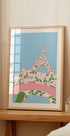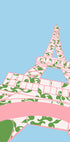 Una ilustración moderna y animada de la Torre Eiffel en París, decorada con divertidos motivos florales verdes sobre suaves líneas rosadas contra un cielo azul claro. Esta obra de arte le da un toque fresco, femenino y elegante a uno de los monumentos más emblemáticos del mundo, perfecta para interiores femeninos, espacios inspirados en viajes o como pieza llamativa en la pared.