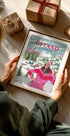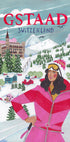 Sumérgete en el glamour invernal de Gstaad con el elegante póster de Caroline Bonne Müller: una mujer segura de sí misma con un traje mono rosa brillante y gafas de espejo contempla los abetos cubiertos de nieve y los tejados de los chalets mientras los Alpes brillan bajo el sol invernal. La tipografía de inspiración vintage le da a la escena un aspecto de viaje elegante y atemporal. Perfecto para soñar con pistas, pinos y après-ski.