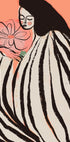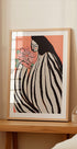 Un cartel onírico y poético con un retrato estilizado de una mujer envuelta en llamativas rayas blancas y negras, sosteniendo suavemente una flor. Con su suave fondo melocotón y líneas expresivas, la obra de arte combina romance, feminidad e ilustración moderna en una expresión decorativa llena de sentimiento y encanto.