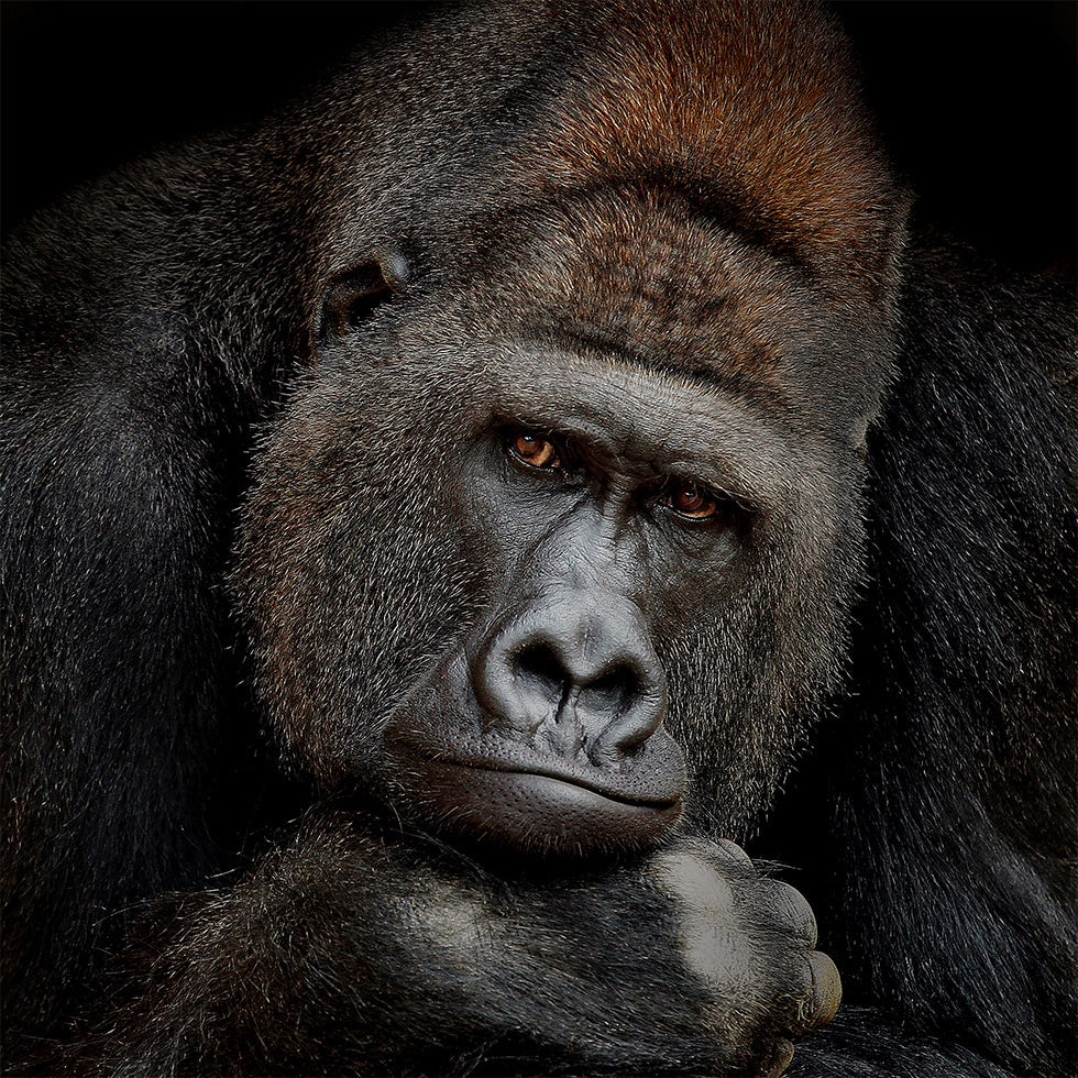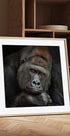 Un póster con un retrato intenso y discreto de un majestuoso gorila de espalda plateada capturado en un momento de tranquila contemplación. Los ojos profundos y sabios se encuentran con los tuyos y crean presencia, vulnerabilidad y fuerza al mismo tiempo. Las sombras resaltan los rasgos distintivos y confieren al motivo una calma escultural y atemporal. Por Antje Wenner-Braun. El título es UN MOMENTO EN CONTACTO.