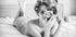 Un elegante póster en blanco y negro que captura un retrato de inspiración retro de una mujer con rizos antiguos, recostada elegantemente en una cama mientras sostiene una cámara clásica. Con una mezcla de sensualidad, nostalgia y expresión artística, la fotografía celebra la atracción femenina y el glamour atemporal.