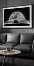 Esta obra de arte surrealista en blanco y negro muestra un árbol solitario bajo una luna llena brillante, con pájaros volando sobre un cielo nocturno de ensueño. Las nubes flotan a través de la luminosa escena, uniendo fantasía y naturaleza en una sorprendente composición que captura el misterio, la maravilla y la elegancia atemporal.