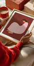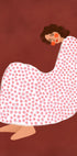En illustreret kvinde sidder indhyllet i en stor, hvid kappe fyldt med lyserøde cirkelmønstre. Hun har mørkt, krøllet hår, røde kinder og en rolig, drømmende fremtoning mod en varm, rødbrun baggrund.