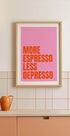 Brillante, audaz y divertido: este póster de tipografía moderna presenta la divertida frase "More Espresso Less Depresso" en texto naranja llamativo sobre un fondo rosa. Una combinación perfecta entre motivación y diversión, ideal para cocinas, oficinas o rincones de café. Perfecto para los amantes del café con sentido del humor.