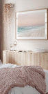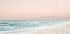 Una apacible fotografía costera que captura olas turquesas rompiendo suavemente en una playa de arena bajo un cielo brumoso de color pastel. Las montañas lejanas crean un horizonte de ensueño que evoca tranquilidad y ambiente vacacional.