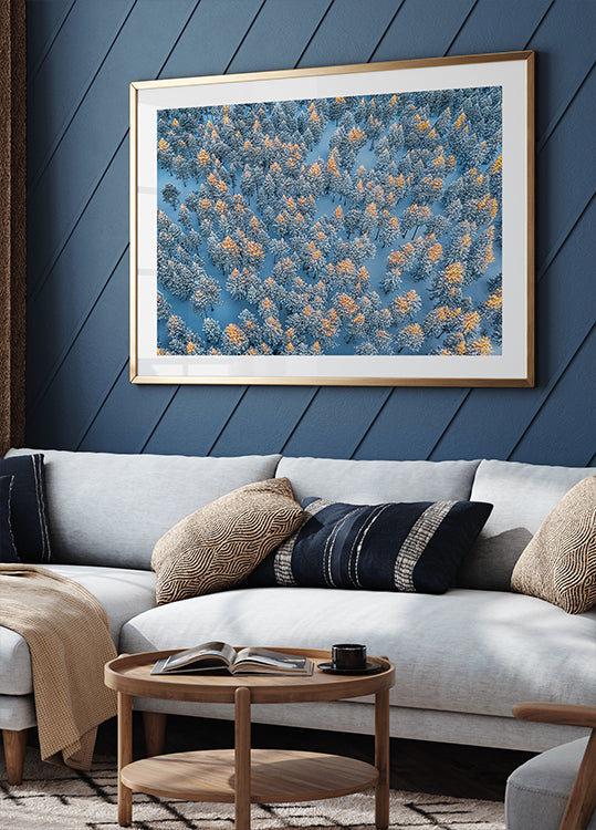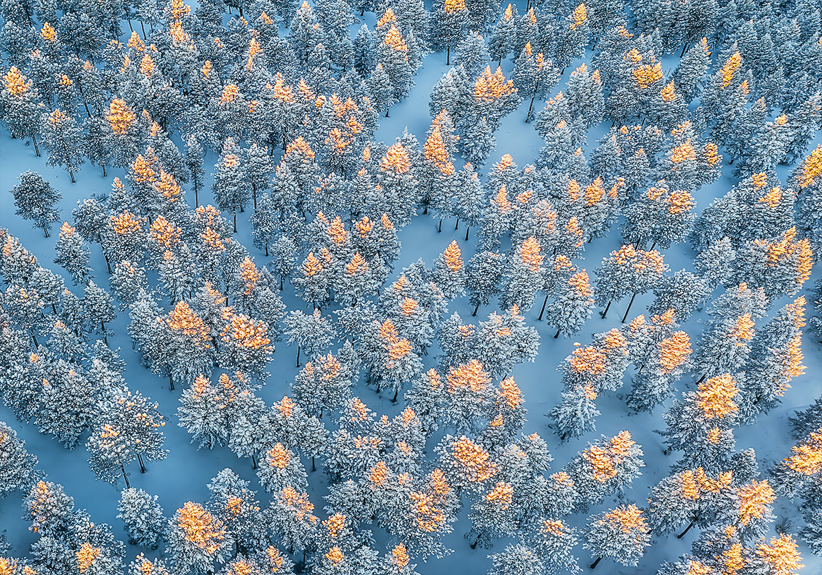 En stille vinterpoesi set fra oven: Sneklædte træer danner et grafisk mønster af blålige toner og frostklar luft. Det luftige droneperspektiv giver dybde og ro, mens lyset tegner subtile kontraster mellem skov og sne. En sofistikeret, abstrakt naturstudie af Mei Xu til moderne rum. Perfekt som roligt fokuspunkt i hjemmet.