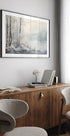 Et drømmende vinterlandskab i dæmpede, nordiske toner: tåge svæver over en stille sø, hvor frosne grene og nøgne træer spejler sig i det hvide. Den minimalistiske komposition indfanger naturens ro og kulde på poetisk vis. Skabt af kunstneren Bilge Paksoylu. En stille invitation til fordybelse og drømme i vinterens tåge.