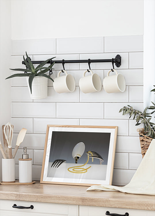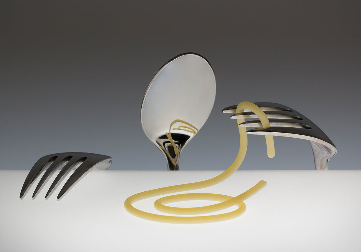 Un bodegón lúdico donde tenedores, una cuchara y un hilo de espagueti crean una composición humorística. Los cubiertos están dispuestos como figuras, mientras que la pasta actúa como un cabello suelto. Esta ingeniosa obra de arte mezcla comida y fantasía, transformando una comida cotidiana en un retrato artístico surrealista.