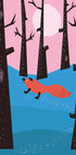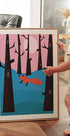 Winter Fox de Nicholas representa a un zorro rojo en un tranquilo bosque invernal, iluminado por la luz de la luna. Las formas geométricas y las líneas finas se encuentran en una composición minimalista y divertida con suaves tonos pastel de rosa y azul. Los árboles cubiertos de nieve y un cielo nocturno despejado le dan al tema una calma poética y de ensueño. Perfecto para habitaciones infantiles e interiores modernos.